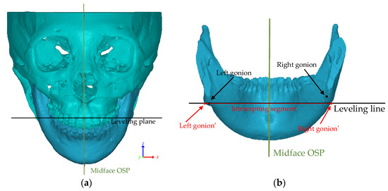 The leveling plane in (a) frontal view, (b) rear view. In this case, the intercepting segment was defined as the segment between the maximum and minimum x-value vertices, the right and the left gonion of the mandible in 3D on the leveling plane.