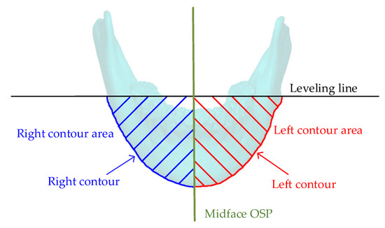 The region of interest in the mandible region is below the leveling plane. The mandible contours on the frontal view and the frontal downward inclined view were obtained by the computational theory of the Canny edge detection method [36]. The midface OSP divides the prescribed mandibular contour into left and right contours. Left and right contour areas were enclosed by the boundaries of the leveling line, the symmetry line, and left or right contour, respectively (Figure 4). Asymmetry assessments of mandibular contour were carried out in both frontal and frontal downward inclined views, by means of the frontal mandibular contour and the inclined mandibular contour.