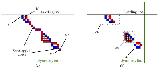 The symmetry line is the intersecting line between the midface OSP and the projection plane, which separates the mandibular contour into left and right. Below the leveling line, there are m pixels in the left, and n pixels in the right. Hence, the floating pixel lengths of left and right contours become