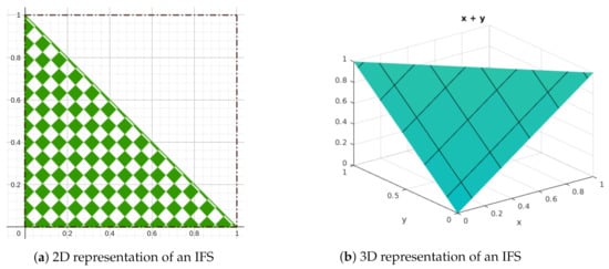 where are the satisfaction and dissatisfaction grades, respectively. The condition for an IFS is that . A doublet set is said to be an intuitionistic fuzzy number (IFN). The graphical representation of the two-dimensional (2D) and three-dimensional (3D) plots of an IFS is given in Figure 1.