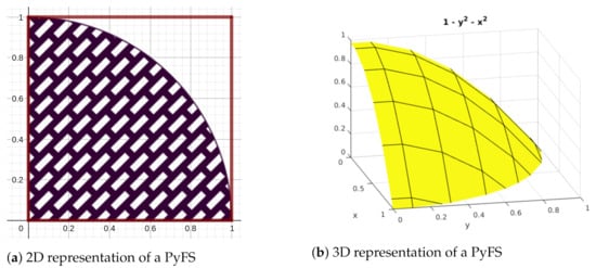 where are the satisfaction and dissatisfaction grades, respectively. The condition for a PyFS is that . A doublet set is said to be a PyFN. The graphical representation of the 2D and 3D plots of a PyFS is given in Figure 2.