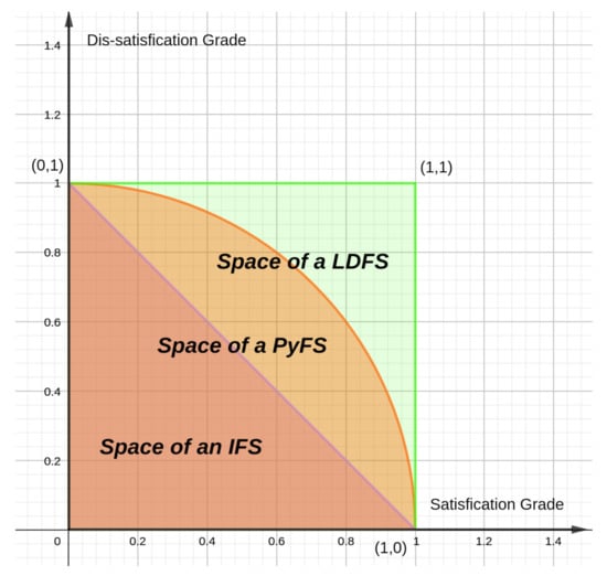 where are the satisfaction grade and dissatisfaction grade and are the reference parameters, respectively. These grades satisfy the constraint for all and with . In describing or classifying a specific system, these comparison parameters will help. By moving the physical meaning of these parameters, we can categorize the system. They expand the space used in LDFSs for grades and lift the limitations on them. The refusal grade is defined as , where γ is the refusal reference parameter. The linear Diophantine fuzzy number (LDFN) is defined as with and . The graphical representation of the 2D and 3D plots of an LDFS can be seen in Figure 3, and the comparison spaces of the IFS, PyFS, and LDFS are given in Figure 4.
