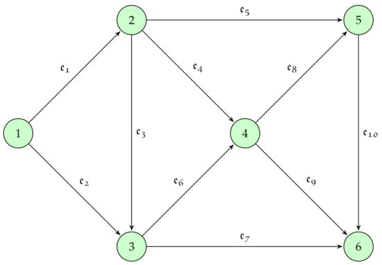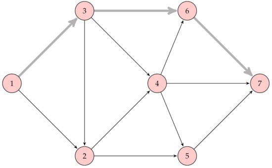 The graph is an LDF-directed graph, where and represents the vertex and edge set, respectively. The ordered pair denotes an edge of the graph that connects the two different vertices . It is considered a connected network with given arcs and nodes in which is the SN and is the TN. It is assumed that from the node to the node , there is only one directed arc. The route (path) from node to node is a series of arcs in which each arc’s initial node is the same as the corresponding arc’s terminal node in the sequence. The cost of the path that is directed is specified as the route costs the sum of the arc. The problem is to identify the SP between and for each arc-related parameter in terms of cost (or time, or space, etc.). In terms of LDFNs, this parameter is assumed to be , where is the satisfaction grade, is the dissatisfaction grade, and , are the reference parameters of the arc . This is included in the shortest path with respect to the cost for traveling along the arc .