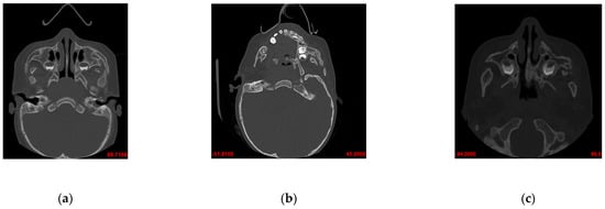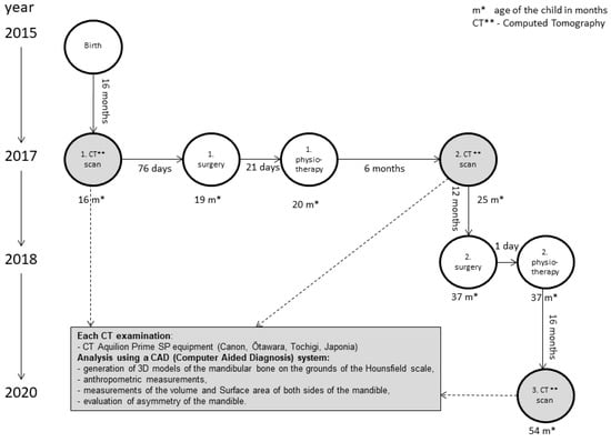 Three computed tomography (CT) examinations of the facial skeleton were performed for the analyzed case (Figure 3). All diagnostic CT examinations were conducted in the same Children’s Hospital in Poland, using the same equipment, namely CT Aquilion Prime SP (Canon, Ōtawara, Tochigi, Japan), and with the same technician performing the examination. This enabled the obtainment of 2D images of particular sections of the patient’s body. The technician performing the tests was not aware of the purpose of this case study.