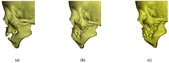 The first examination (prior to the first surgical procedure) was conducted for diagnostic purposes in 2017, when the child was 16 months old (Figure 3a). Scanning was performed at a resolution of 512 × 512 px, pixel size of 0.326 mm, slide thickness of 1.0 mm. The second CT examination was also performed in 2017 (25th month of life) and was a control examination taking place six months after the first surgical procedure (Figure 3b).The scanning parameters were as follows: resolution: 512 × 512 px, pixel size: 0.377 mm, slide thickness: 0.625 mm. After the second surgical procedure, the third control CT examination was performed in 2020 (at 4 years and 6 months—54 months; Figure 3c).The scanning parameters were as follows: resolution: 512 × 512 px, pixel size: 0.263 mm, slide thickness: 0.5 mm. The obtained data were saved in the DICOM format (Digital Imaging and Communications in Medicine). On the basis of the Hounsfield scale, it was possible to select individual tissues/structures (e.g., bones) and generate 3D models (Figure 4). Taking into account all CT examinations, the researchers performed segmentation of the mandibular bone. Next, anthropometric measurements were carried out. A long-term assessment of the asymmetry of the mandible was conducted using a computer-aided diagnosis system [30]. All analyses of the changes within the mandible were conducted using the symmetrical approach devised by one person. The above-mentioned method is based on the assumption of the symmetry of the skull’s build in relation to the median sagittal plane [31]. Mimics v16software was used (Materialise, Leuven, Belgium). The applied approach enabled the determination of linear and angular measurements of three-dimensional objects, such as vertical, median-lateral and anterior-posterior, as well as surface asymmetry index (AI) and volume index. The above-mentioned approach also enabled the comparison of the results obtained in the analyses performed at long intervals. Measurement errors are within the limits of the CT images resolution, whereas the voxel resolution amounts to ±0.5 mm [32].