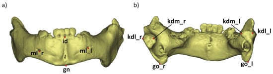 Standard anthropometric points in the obtained 3D models of the mandible were designated in accordance with Martin and Saller’s methodology [33]. On the basis of the above-mentioned points (Figure 5), the following even and odd measurements were carried out: