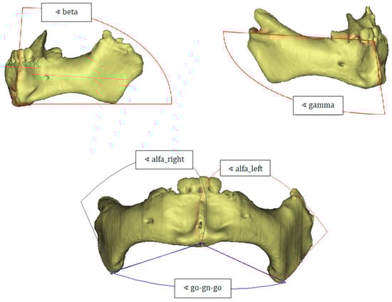Anthropometric angles of the mandible: go.l–gn–go.r—the angle of mandible, alpha—gonial angle, beta—mental angle, gamma—superior mandibular symphysis angle.