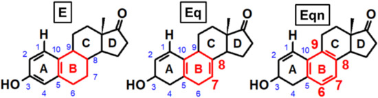 One of the most popular HRT medications is conjugated equine estrogens (CEEs), which are isolated from the urine of pregnant mares and sold under the brand name “Premarin” among others. CEEs consist of the sulfate conjugates of horse-specific “equine estrogens”, equilin (Eq), and equilenin (Eqn), besides those of estrone (E), which is an endogenous estrogen in both humans and horses [6]. The latter three estrogens (referred to generally as “Ex” in the following paragraphs) possess a highly similar molecular structure as they only differ in the degree of unsaturation of ring “B”: the cyclohexene ring of estrone is replaced by more symmetrical cyclohexadiene and benzene rings in equilin and equilenin, respectively (Figure 1). Though Eq and Eqn retain the hormonal activity of E in humans [7,8], this fact does not exclude the possibility of ring-“B”-dependent reactivities on potential carcinogenic pathways [9].