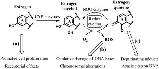 Summary of possible carcinogenic effects originating from estrogen hormones (a), their catechol metabolites (b), and their quinone metabolites (c). For clarity reasons, only ring “A” of the estrogen derivatives is presented. (CYP: cytochrome P450; NQO: NAD(P)H:quinone oxidoreductase; ROS: reactive oxygen species).