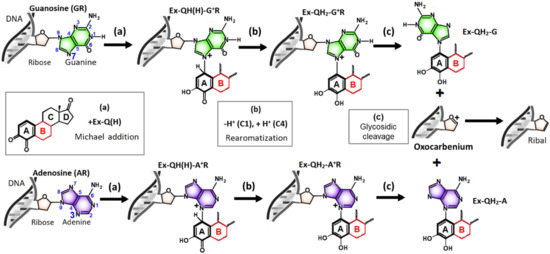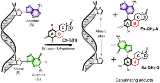 It is known that 3,4-orthoquinones (marked as Ex-Q(H) in Figure 3, where Ex is a general term referring to E, Eq, or Eqn, while Q indicates the 3,4-quinone form and “(H)” highlights the presence of a H atom on C1), formed upon the metabolic oxidation of estrone, equilin, and equilenin [21,22,23], are able to cross the nuclear membrane through either passive diffusion or active transport mediated by estrogen receptor alpha [17,24]. In the cell nucleus, these quinones are apt to attack the nucleophilic sites of deoxyadenosine (AR) and deoxyguanosine (GR). This induces a multistep reaction, ending up in the cleavage of the glycosidic C-N bond, which yields a “depurinating adduct”, Ex-QH2-G or Ex-QH2-A, and an abasic site in the DNA chain (Figure 3, right) [18]. The latter might be readily converted to a point mutation site by false DNA repair. In the long run, the accumulation of such mutations leads to carcinogenesis.