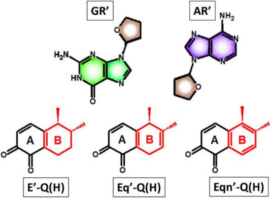 (a,b) Chemical formula and nomenclature of intermediates and transition states involved in rearomatization. Ring “B”, differentiating E’, Eq’, and Eqn’ derivatives, is highlighted in red. The general term Ex’ in the nomenclature refers to any E’, Eq’, or Eqn’. (c,d) Computed Gibbs free energy profile of the rearomatization of the Michael adduct. The zero point of the relative Gibbs free energy scale is set to the molecular Gibbs free energy of the initial state (Ex’-Q(H)--Bx+R’, where “Bx” refers to any of the purine bases.).