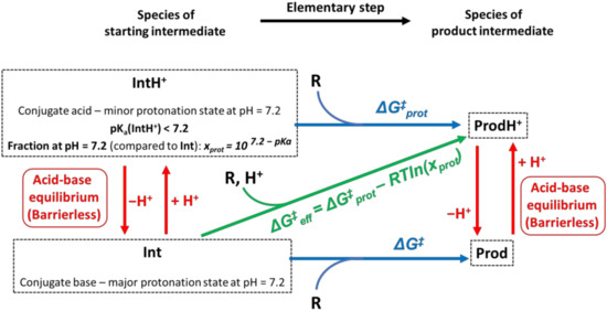 can be defined, which can be directly compared to the computed for the reaction with the dominant “Int” species. (Roughly speaking, the term can be grasped as the Gibbs free energy level of IntH+ over Int at the considered physiological pH.)