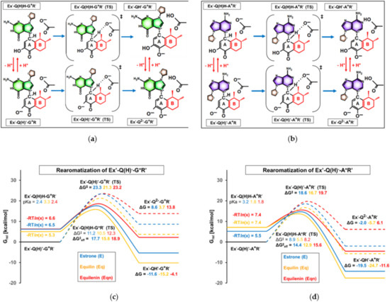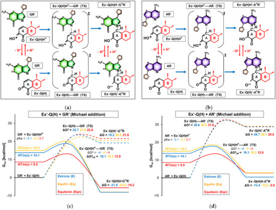 At the beginning of our investigations, we calculated the barrier of the direct reaction between the quinone Ex’-Q(H) and the nucleoside GR’ or AR’ (bottom row in Figure 7a,c). (The nucleosides or nucleoside-derived molecule parts will also be referred to as BxR’ in the Discussion section, where Bx stands for any of the bases of G and A). According to the results shown in Figure 7b,d (see dashed lines), the Gibbs free energy level of transition states Ex’-Q(H)–GR’ (TS) (21–23 kcal/mol) and Ex’-Q(H)–AR’ (TS) (30–31 kcal/mol) are closely independent of ring “B”. However, considering that the high obtained values indicate a negligible rate of direct Michael addition at biologically relevant temperatures—especially if nanomolar concentrations of estrogen metabolites are present, as expected in the breast cells of HRT patients—the latter finding becomes irrelevant. Thus, it is necessary to take into account the non-dominant protonation states of the reactants, and the barriers with E’, Eq’, and Eqn’ derivatives need to be compared in the kinetically most favorable route of the initial addition step.