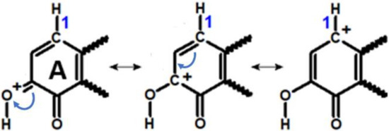 Resonance structures of ring “A” of protonated estrogen-3,4-quinones. Note the positive charge of the C1 atom on the right.