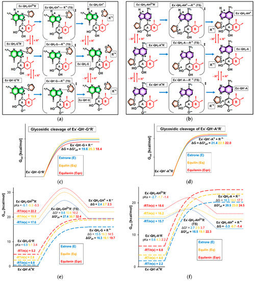 The product of the previous rearomatization step is commonly assumed to be Ex’-QH2-Bx+R’ (see the middle of the left column in Figure 10a,b) [19,25], which would derive from the instantaneous protonation of the Ex’-Q2--Bx+R’ or Ex’-QH--Bx+R’ formed upon rearomatization (Figure 9a–d, product intermediates). Nevertheless, the pKa values of 2.2–6.9, calculated for Ex’-QH2-Bx+R’, clearly reveal that the dominant species at physiological pH is the overall neutral Ex’-QH--Bx+R’ (Figure 10a,b, bottom left). Thus, we began investigating the glycosidic cleavage by examining the decomposition of Ex’-QH--Bx+R’ → Ex’-QH--Bx + R’+. The resulting Gibbs free energy profiles are visualized in Figure 10c,d.
