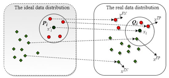 Let’s keep it simple; only consider the nearest data samples of the sample in real data distribution. As shown in Figure 1, let be denoted as the set of nearest samples of the in the ideal data distribution, and represents the set of nearest samples of the in the real data distribution. For any sample except , it can be represented by , , , and . The meanings of these four kinds samples are presented as follows: