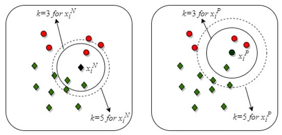 An intuitive demonstration of how the proposed method works is presented in Figure 2. For the sample in the majority class, both and are suitable to decide whether is in the class overlap region or not, while the sample in the minority class will be recognized to be in the overlap region when . When , the can be correctly recognized to be in the non-overlap region.