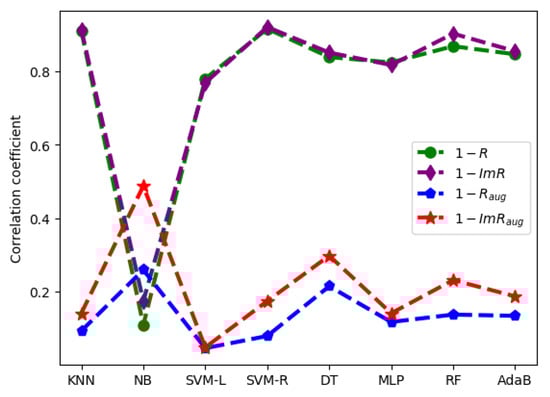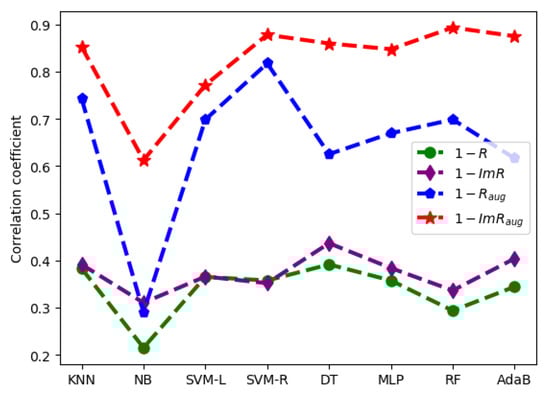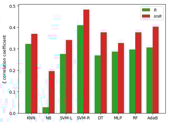 Figure 7 presents the correlation coefficients of the accuracies of different algorithms with the and . It can be seen that the result of the correlation coefficient is also similar to the result of the Pearson correlation coefficient. The correlation coefficient of the accuracy of the NB algorithm with the R is much smaller than that of the accuracies of other algorithms with the R, and the coefficient is largely improved by the . The correlation coefficient of the accuracy of the SVM-R algorithm with the is also the highest. Meanwhile, the correlation coefficients of the accuracies of different algorithms with the are all higher than that with the R. Therefore, the comparison of correlation coefficient also shows that the has a better performance than that of the R.