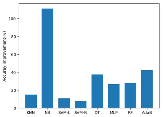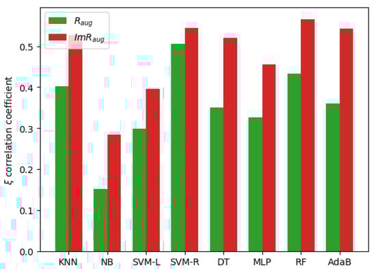 As expected, the and achieve much stronger correlations with the AUC of different algorithms. It is consistent with the result in []. In the following, the detailed correlation results of the and with different classification algorithms are compared. The detailed correlation coefficients along with the p-values of and with the AUC of different algorithms are presented in Table 2. It can be seen that the correlation coefficients of the with the AUC of the DT, MLP, RF, and AdaB algorithms are all lower than 0.7, while the correlation coefficients with the AUC of these algorithms are all improved to more than 0.8 by . On average, the achieves a 34.7488% improvement to the . An illustration of the correlation coefficient improvements of over is shown in Figure 4. The correlation coefficient between and the AUC of the NB algorithm is largely improved by the proposed .