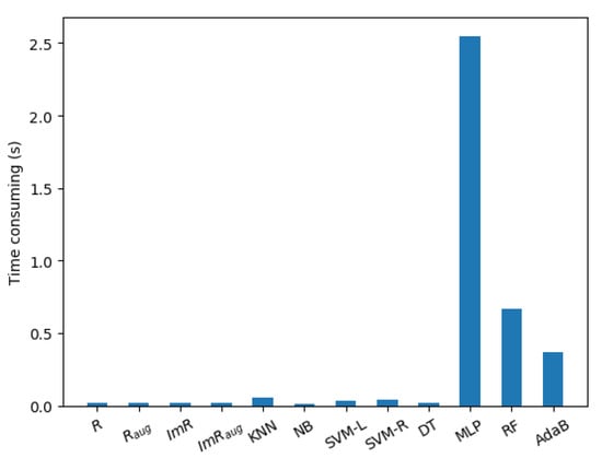 The average time-consuming comparison of different overlap metrics and 5-fold cross validation of different classification algorithms is shown in Figure 8. It can be seen that the MLP algorithm has the most time-consuming performance due to the backpropagation. In addition, the RF and AdaB algorithms are also very time consuming because of the ensemble learning. In addition, these overlap metrics have a similar time consuming performance and the consuming time of the KNN algorithm is approximately four times that of the overlap metric. The main reason is that the k-nearest neighbors searching is the most time-consuming process for these overlap metrics and the KNN algorithm. The searching process will be conducted in the range of n samples for a dataset, and it will be conducted five times in the range of samples for the 5-fold cross validation of the KNN algorithm. Therefore, the result is consistent to the analysis and the proposed overlap metrics are also superior in terms of time consumption.