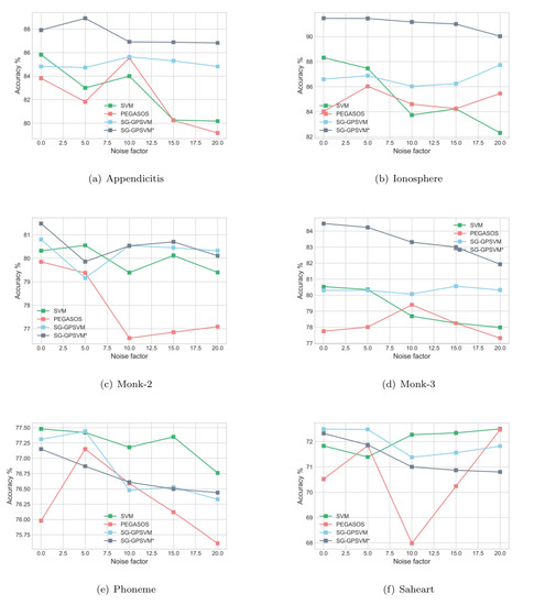 Table 2 shows the results for a linear and nonlinear kernel on six different UCI datasets by applying conventional SVM, Pegasos, and our proposed SG-GPSVM. From the experimental outcomes, it can be seen that the classification performance of SG-GPSVM is better than that of the conventional SVM and Pegasos on most of the datasets in terms of accuracy. From Table 2, our proposed SG-GPSVM yielded the best prediction accuracy on four of six datasets. In addition, when we varied the number of noisy samples from (noise-free) to , our proposed SG-GPSVM exhibited better classification accuracy and stability than the other algorithms no matter the noise factor value, as shown in Figure 2. On the Appendicitis dataset, when the noise factor increased, the accuracy of the conventional SVM and Pegasos fluctuated greatly. On the contrary, the classification accuracies of our proposed SG-GPSVM were stable. Similarly, on the other datasets, such as Monk-3 and Appendicitis, the accuracies of the conventional SVM and Pegasos not only varied greatly, but they also performed worse than our proposed algorithm. This demonstrates that our proposed SG-GPSVM is relatively stable, regardless of the noise factor. In terms of computational time, our proposed algorithm cost nearly the same as Pegasos. The computational time of Pegasos and our proposed SG-GPSVM on the largest dataset was longer than the computational time of the conventional SVM on the smaller datasets.