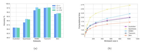 The experimental results of three different minibatches for SG-GPSVM and the accuracy and computational time results of the methods are illustrated in Figure 3. Subfigure (a) shows how the accuracy changed in terms of the batch size, and the curves in Subfigure (b) show how the computational time changed in terms of the batch size. We can see that when the size of the minibatch increased, the accuracy increased, and the computational time increased approximately linearly when the batch size increased. The datasets Spambase and WDBC were taken into consideration. It is evident that if the minibatch size k is small enough, is more accurate than . However, when using a large minibatch size of , the accuracy decreased and the computational time increased. This suggests that in the scenarios in which we care more about the accuracy, we should choose a relatively medium batch size (it does not need to be large).