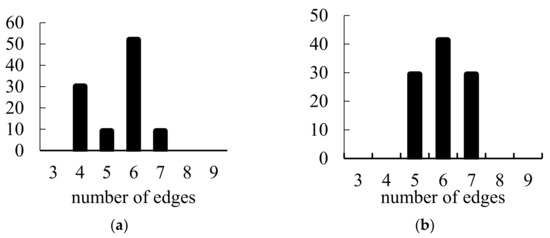 where is the portion of the polygons possessing n edges in a given Voronoi diagram (also called the coordination number of the polygon) and is the total number of polygon types with different number of edges [4,5,6,7,8,9,10,11,12,13]. The summation in Equation (1) is performed from i = 3 (the smallest possible polygon—a triangle) to the largest coordination number of the polygon, e.g., for a hexagon, the largest value of i is 6.