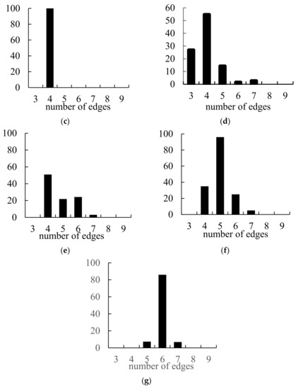 Distribution of polygons in different types (a, b, c, or combinations) of Voronoi diagram arising from the Penrose tiling (Figure 3), is depicted. Number of edges is put at the abscissa axis, percentage of polygons is put at the y-axis (a) a-type Voronoi tessellation; (b) b-type; (c) c-type; (d) ab-type (a and b-types combined); (e) ac-type; (f) bc-type; (g) abc-type (a, b, and c-types combined).