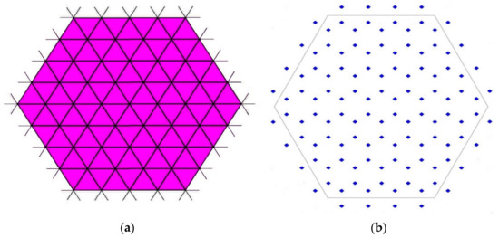 Ideal Voronoi diagram (a) emerging from the hexagonal pattern of points (b).