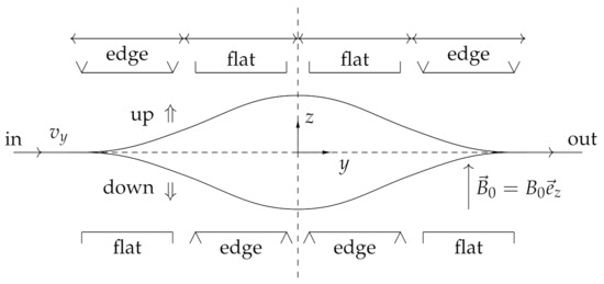 In the traditional design, at least four Stern–Gerlach magnets have to be employed. As the particle goes through the apparatus, the partial beams corresponding to the spin-up and spin-down components are first imparted a momentum, which leads to their spatial separations, as seen in the schematic trajectories in Figure 1. Subsequently, the evolution both in momentum and position has to be reversed. The second and third magnets first decelerate the particle and then impart momenta equal in magnitude to the momentum gained in the first stage, and finally, the last magnet decelerates the particle, whereupon, if the conditions were ideal, we should find the partial beams reunited and the particle in a pure spin state.