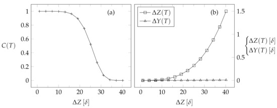 We calculated the quantum dynamics of the original Hamiltonian of Equation (7), again varying the peak separation and measuring the final spin coherence . The peak separation–spin coherence curve together with the final relative displacements of the partial beams in y and z coordinates are presented in Figure 4. Although for very small separations up to the partial beams are recombined coherently—note that this does not mean that the evolution was fully reversed: the spreading of the wave packet, though inconsequential, has not been undone—once the peak separation exceeds this value, the evolution rapidly becomes irreversible, with indicating complete spin decoherence by the time separation reaches . The cause of this loss of spin coherence is the growing microscopic separation in the Z and Y axes between the up- and down-spin components, as shown in Figure 4b, which, although barely exceeding in Z and negligible in Y, is enough to completely prevent coherent beam recombination.
