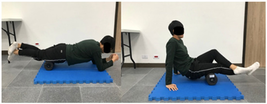 In this protocol, after a 5 min jogging exercise, the participants performed GW, followed by three sets of VR for exercising the quadriceps and hamstrings of each leg (Figure 1). The intensity of the vibration foam roller (Vyper 2.0, Hyperice, Irvine, CA, USA) can be set to between 48, 60, and 72 Hz at three different levels. The vibration foam roller was operated at a vibration frequency of 48 Hz. The VR exercise involved lying on the floor and actively rolling the roller back and forth on target muscle groups. Each set of VR was performed for 30 s at a rate of 30 rolls per minute (1 s up, 1 s down) with the help of a metronome [28]. The pressure pain intensity was instructed to maintain at 4–5 on a 10 mm visual analogue scale (VAS), based on each participant’s verbal feedback.