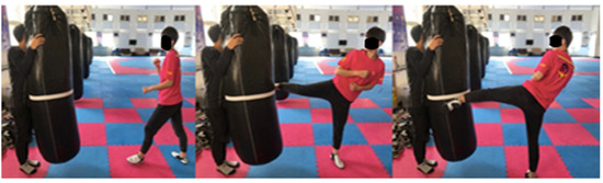 This test comprised five sets of frequency speed of kick tests (FSKTs). Each set lasted 10 s, with a 10 s rest interval prescribed between sets. After a sound signal, the participant was required to kick a boxing bag as fast and as hard as possible by applying the roundhouse kick technique and alternating their right and left legs (Figure 2). The performance was determined by the number of kicks in each set and the total number of kicks. To determine the rate of fatigue, a kick decrement index (KDI) was calculated as a percentage for each set. The test has an ICC of 0.85–0.95 [14,38]. Heart rate was recorded with a heart rate monitor (Polar V800, Kempele, Finland). Rating of perceived exertion (RPE) was rated on a Borg scale of 0–10, with 0 indicating no exertion and 10 indicating maximal perceived exertion [39].