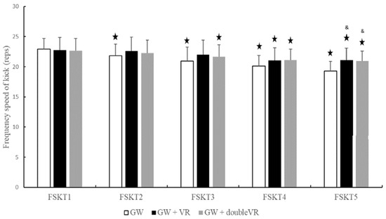 Frequency speed of kick test in different warm up conditions. ⋆ Statistically significant difference with FSKT1 (p < 0.05). &: Statistically significant difference between GW and GW + VR or between GW and GW+ double VR (p < 0.05).