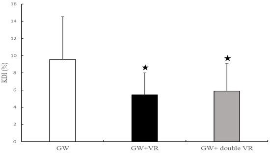 The kick decrement index (%) in different warm up conditions. ⋆: Statistically significant difference between GW and GW + VR or between GW and GW+ double VR (p < 0.05).