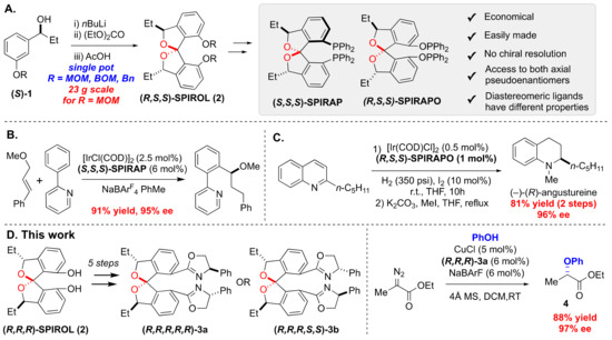 - Zhu, S.-F.; Zhou, Q.-L. Spiro Ligands for Asymmetric Catalysis. In Ligand Design in Metal Chemistry: Reactivity and Catalysis, 1st ed.; Stradiotto, M., Lundgren, R.J., Eds.; John Wiley & Sons, Ltd.: Chichester, UK, 2016; Chapter 4; pp. 66–103. [Google Scholar]