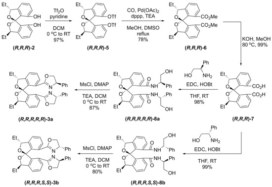 Our studies commenced with the (R,R,R)-SPIROL (2) (Scheme 2), which was obtained in an enantiopure form after recrystallization using the protocol previously described by our group [15,16]. Using 2 as the starting material, the bistriflate (R,R,R)-5 was synthesized in 97% yield by reacting it with triflic anhydride and pyridine. The successful preparation of (R,R,R)-5 prompted the subsequent carbonylation studies with the objective to obtain the diester (R,R,R)-6. After the optimization of the reaction conditions, the carbonylation of (R,R,R)-5 leading to compound (R,R,R)-6 was indeed successfully accomplished in 78% yield. The optimal conditions included using Pd(OAc)2 complexed to dppp as the catalyst, triethylamine and carbon monoxide (1 atm) as the reagents/additives, and methanol/DMSO mixture as the reagent and solvents. The use of 1,3-bis(diphenylphosphino)propane (dppp) was crucial for this step, as the yield was dramatically decreased when either 1,1′-bis(diphenylphosphino)ferrocene (dppf) or 1,4-bis(diphenylphosphino)butane (dppb) were employed for this reaction instead. Considering the successful product formation observed with dppp, no other ligands such as 1,2-bis(diphenylphosphino)ethane (dppe) were evaluated; however, further reaction and ligand optimization may lead to improvements in yields. With these results in hand, biscarboxylic acid (R,R,R)-7 was accessed via hydrolysis with KOH in methanol followed by an acidic work up. Since acid 7 is chiral, its condensation with optically active amino alcohol would produce two diastereomeric products. Therefore, when (R)- or (S)-2-phenylglycinol was used in the presence of hydroxybenzotriazole (HOBt) and 1-ethyl-3-(3-dimethylaminopropyl)carbodiimide (EDC), two pseudoenantiomeric bisamides (R,R,R,R,R)-8a and (R,R,R,S,S)-8b were made respectively. The oxazoline ring formation was achieved by treatment with methanesulfonyl chloride (MsCl), 4-dimethylaminopyridine (DMAP), and triethylamine to afford SPIROX ligands (R,R,R,R,R)-3a and (R,R,R,S,S)-3b in 80% and 87% yield, respectively [27].