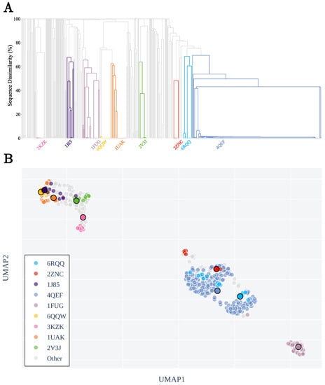 A sequence similarity search was performed for each of our 517 proteins using RCSB PDB Search API []. Using the similarity scores returned by these searches, we constructed a similarity matrix for the 517 proteins, assuming zero sequence similarity between proteins for which no score was reported. We converted the similarity matrix to a dissimilarity matrix by converting and performed single-linkage hierarchical clustering with the function scipy.cluster.hierarchy.linkage []. We used a distance threshold of 70% dissimilarity to produce a clustering of the 517 proteins. We extracted the nine largest clusters from these clusters to study.