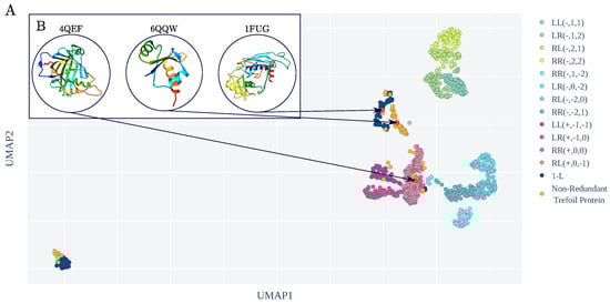 When analysing pairwise distances between protein and configuration cores, each trefoil protein core appears to have a knotoid distribution highly similar to either those of 1-L trajectories or of simple 2-L trajectories. This is particularly evident when looking at the distances between our generated trajectories and the list of non-redundant trefoil proteins taken from KnotProt [], as visualised using a UMAP [] projection in Figure 4. Our results are coherent with the fact that complex 2-L configurations exhibit knot fingerprints that are not compatible with those of trefoil proteins []. Indeed, trefoil proteins are distributed unevenly between the two simple groups (1-L and simple 2-L trajectories), with the vast majority having a knotted core with topological complexity indistinguishable from that of simple open-ended trefoil cores, i.e., from the 1-L trajectories. In particular, all of the non-redundant deeply knotted proteins we considered share this feature. Again, this is coherent with previously simulated folding pathways for deep trefoil proteins [,,], all involving the creation of a single twisted loop. This single loop can form either in a native state, as for the threading mechanisms, or unfolded, as in the loop flipping hypothesis. We emphasise that our computations demonstrate that the presence of two pierced loops in an open trefoil inevitably results in increased complexity of its knotoid distribution, making it substantially different from that of a simple trefoil; indeed, all three double-loop clusters appear clearly isolated in Figure 4. Therefore, our results provide strong evidence that the double loop folding mechanisms [] can be excluded for deeply knotted trefoil proteins.