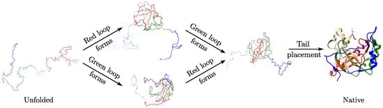 To test this hypothesis, we performed coarse-grained simulations of folding for the carbonic anhydrase with PDB code 4QEF. This protein features a very interesting ‘spine’ of -sheets, which joins together different parts of the protein. In particular, one can identify a small fragment of the chain extruding from the -sheet core, which can be interpreted as one loop, shown in green in Figure 5, as well as a long fragment surrounding the entire -core, which could be interpreted as the second loop, shown in red in Figure 5. The C-terminal tail protrudes from the inner loop and pierces the outer loop, eventually forming the knot. The folding of this protein starts from the formation of the -sheet core and hence, the two loops are formed at the initial stage of the folding process. The -sheet can be formed starting either from the formation of the outer red loop, or the internal green loop, as shown in Figure 5. Once both loops are formed, the tails are then placed and the simulations suggest the existence of two different pathways, depending on which tail is placed first. Similar behaviour was observed in the case of the -knotted UCH-L [], which was used as a example of a protein following a double-loop folding mechanism by Flapan et al. []. This mechanism, although not evidently confirming the mixed threading/mouse-trap movement event, is more complex than a simple threading mechanism observed for deeply knotted proteins.