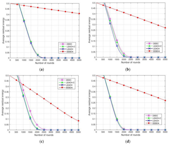 As illustrated in Figure 10, the residual energy of the sensor nodes is compared after multiple simulations run over LEACH, LEACH-C, DEEC, and EEBDA in WSNs. The total residual energy of the network considers the residual energy of all the nodes in each round. This metric is reported in Figure 10, which shows that the proposed scheme (EEBDA) saves more energy than the other protocols. In Figure 10, the maximum number of rounds is 5000; as shown in the figure, the average residual energy in the WSN varies with the number of rounds. For example, when the number of rounds is approximately 2250, the average residual energy of the other three algorithms is approximately zero. We considered the distance between the sender and receiver, the cluster size, and the spatial correlation among sensor nodes. Therefore, the EEBDA scheme has a lower energy consumption than the other algorithms, and the proposed scheme can prolong the lifetime of a WSN. It is clearly shown in the Figure that the energy dissipation of the proposed protocol is less than that of all the other schemes.