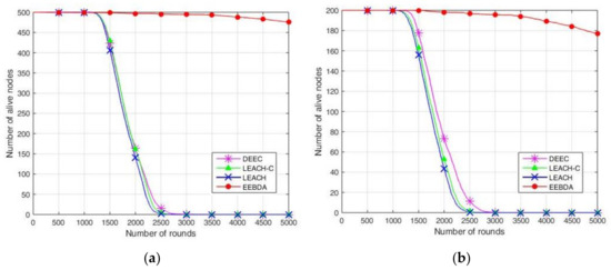 To evaluate the proposed EEBDA algorithm more accurately, we compared it again with LEACH, LEACH-C, and DEEC from surviving sensor nodes. In Figure 11, the results show the number of surviving sensor nodes after 5000 rounds; the sensing area is 100 m2 and 200 m2, and the number of network nodes is 100, 200, and 500 for LEACH, LEACH-C, DEEC, and EEBDA.