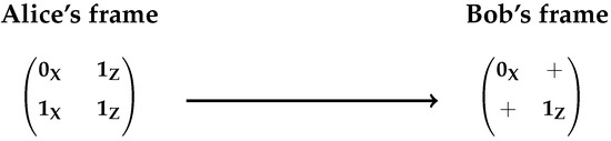 A two order frame, as it can be seen in Figure 1, is a 2 × 2 matrix, structured by two rows and two columns. One row represents a pair of non-orthogonal states where the first column of the frame contains the base encoded quantum bit or and the second column the base quantum bit, that is or where . Once Bob measures a pair of non-orthogonal states and provided he gets a DMDE (Double Matching Detection Event), he obtains the encoded bit in the first or second column of the first row of the frame, as shown in Figure 1 and Figure 2. Bob’s frame is complete once he gets the second DMDE.