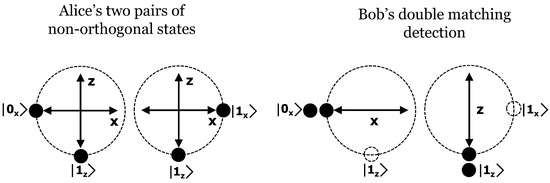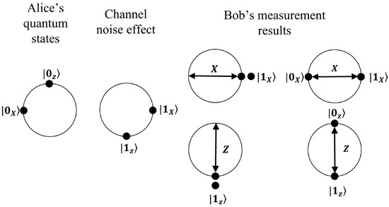 Whatever the type of the noise in the quantum channel, be it rotation noise or dephasing noise [22], it can be interpreted as a Bloch sphere rotation axis causing a variation in the polarization of the quantum state [23], thus producing errors in the information encoded in it. Suppose, for example, that due to the effect of channel noise, state moves to and state becomes as represented in Figure 4. If Bob uses the basis X to measure the pair of non-orthogonal states (, ), there are two probable outcomes: