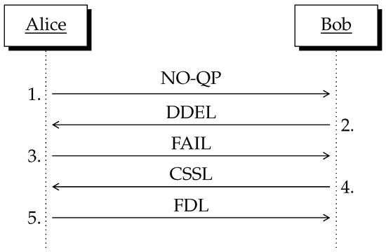 The reconciliation message exchange: NO-QP represents the quantum pulses over the quantum channel. Remaining steps take place over the classical channel. The meaning of the acronyms used is shown below. NO-QP: Non-Orthogonal Quantum Pairs. DDEL: the Double Detection Event List. FAIL: the Frame Arrangement Information List. CSSL: the Composed Sifting String List. FDL: the Frame to Delete List.
