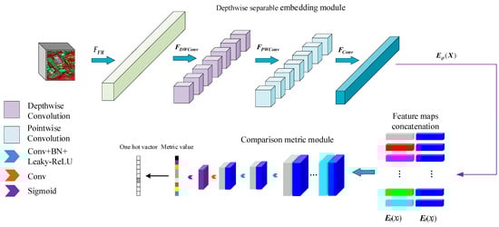 It is known that the support samples and query samples generate the sum of two sets of feature vectors and size of through the depth separable embedding model, and a feature vector with size is generated after symmetric splicing operation , as shown in Formula (11). If the number is equal between and , the symmetric splicing operation recombines the unevenly distributed and and one-to-one splices to form a feature space with symmetric structure. Each time, a group of samples is mapped onto the comparative metric model. By measuring the metric distance between the symmetric structures of the samples, a small number of features can be effectively used to obtain the attributes of samples and reduce the dependence of the model on training samples.