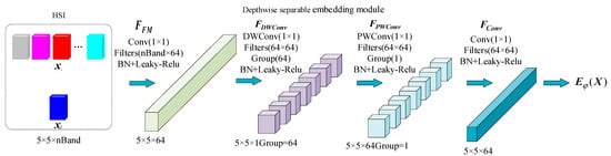 In this paper, the neural network with depthwise separable convolution is introduced as the feature extraction network of the embedded model. The network is composed of a convolution layer, a depthwise separable convolution layer, the Leaky-ReLU activation function and a normalization layer. To train small amounts of sample data more fully, the lightweight depthwise separable convolution network model is introduced, which not only saves the computational cost, but also improves the training efficiency of the model. The Leaky-ReLU activation function is introduced to further accelerate the convergence speed and reduce the emergence of silent neurons. Because hyperspectral data have rich spectral information and spatial information, each hyperspectral pixel and its band number (nband) are set as the input, and the model input size is . Since the model is trained on a small number of labeled samples, reducing the parameters in the network is more conducive to training; therefore, the size of convolution kernel in neural network is set as . At the same time, the number of filters per layer is set to 64, and the final output is . The relational model contains three conventional convolution layers and convolution kernel, the Leaky-ReLU activation function, two BN layers and one Sigmoid layer. Table 1 shows the parameter settings of the depthwise separable embedding model.