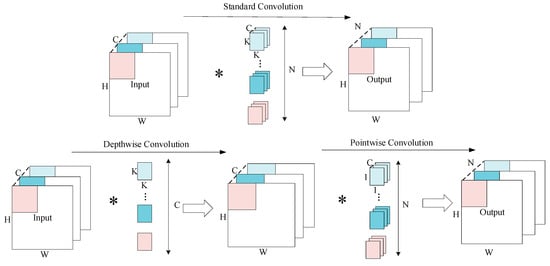 The depthwise separable convolution performs a single channel filtering operation for each input channel, added after the depthwise convolution filtering, and performs pointwise convolution. It is assumed that the input samples have a depth convolution size of and are divided into groups, then, each group performs conventional convolution, which is equivalent to extracting the spatial features of each input channel , that is, the features of DW, and the output is size of . The features of each sample point after pointwise convolution have a size of , i.e., the features of PW, and the output is size of . Formula (5) represents depth convolution and Formula (6) represents point-by-point convolution. The structure of depthwise separable convolution is shown in Figure 4, where is convolution operation.