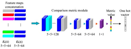 Then, the output feature vector is mapped to , and the distance between the eigenvector and is measured by a convolution layer size of . The feature vector with size is generated, and a relationship score with size is generated by to analyze the similarity between samples. Finally, is compared with , which is the class with the highest relationship score. The comparison metric model is shown in Figure 5.