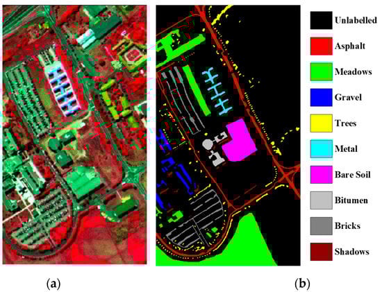 Pavia University dataset. (a) False color map; (b) ground truth map.